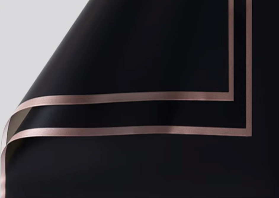 Black matte floral wrap with rose-gold borders, perfect for bouquets, arrangements, and gift packaging. Durable, waterproof, and easy to shape for a clean, professional finish. Each pack includes 20 sheets.